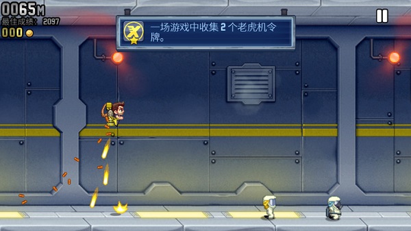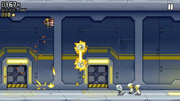 游戏中人物一直处于向前飞行的状态,我们不能控制人物的进退,只能够控制上下方向。人物在不断的奔跑中,还需要躲避导弹、激光器以及电激光链(后期小编会对这些道具一一介绍)如果,被上面三个武器碰到,那么游戏也就结束。而疯狂喷气机游戏中还会出现很多有益的道具,比如飞鸟、喷火龙、机甲等。