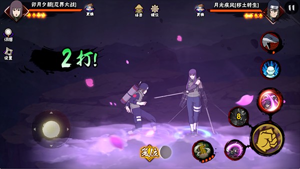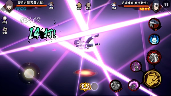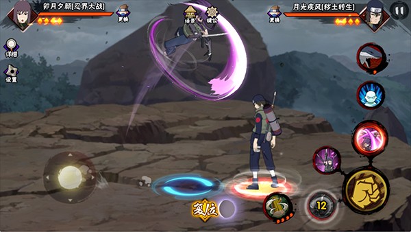 将二技能图标滑向一技能图标会发动联合攻击。这个联合攻击无论是否打中对手,都会立即将月力槽充满。并且联合技带有无敌效果,经测试是零帧触发的无敌,比如在忍战带土释放奥义的过程中就能快速释放出来,还能用无敌规避掉大量的伤害。