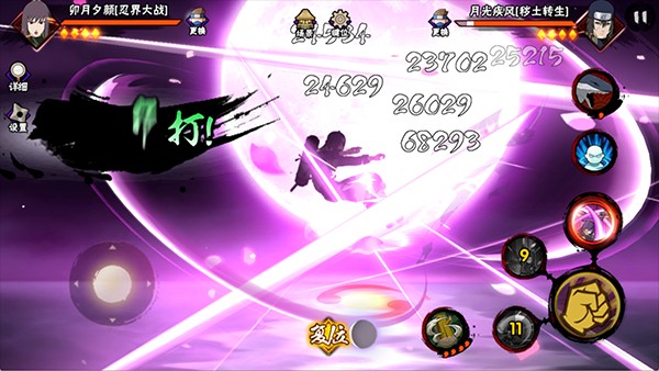 传说忍者任你驱遣操作,木叶十二小强、指导上忍、传说三忍、砂之国忍者……告别单一角色体验,任意切换,肆意挥洒!