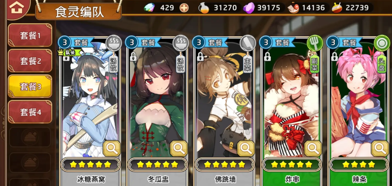 2、第一套的阵容组成有鸡翅、热香饼、凉粉、冰糖燕窝和大吟酿,这是一个伤害非常高的队伍,冰糖燕窝在这个队伍里可以进行10次攻击,大吟酿不仅攻击力高,还能抗伤害,鸡翅能让冰糖燕窝和大吟酿的技能费用减少2点,不管是在什么模式下都非常能打。