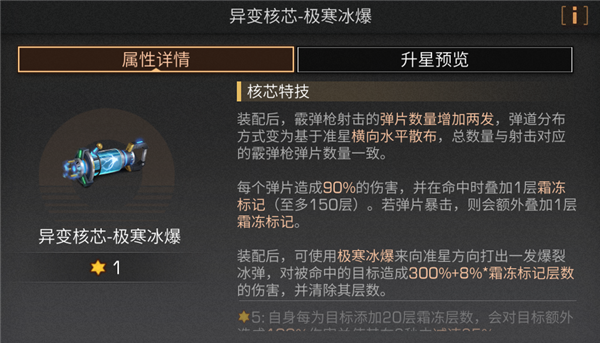 霰弹枪射击的次数增加2发,弹道分布变为横向水平散布(总数量一致),霰弹枪每个弹片造成90%的伤害,在命中时将叠加一层霜冻标记,若弹片暴击则额外叠加一层霜冻标记并增加极寒冰爆技能,可以向准星方向打出一发爆裂冰弹