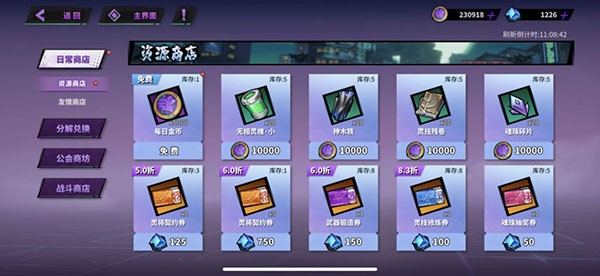 上面提到的资源商店只是黑市商店的一部分,其实黑市商店共分为4大块,日常商店、分解兑换、公会商店以及战斗商店,其中战斗商店是后面玩法解锁之后对应的兑换商店,公会商店需加入公会才有,下面公会介绍会提到。