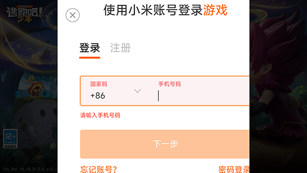1、进入游戏内,玩家先需要利用小米账号登入或者手机号进行登入。