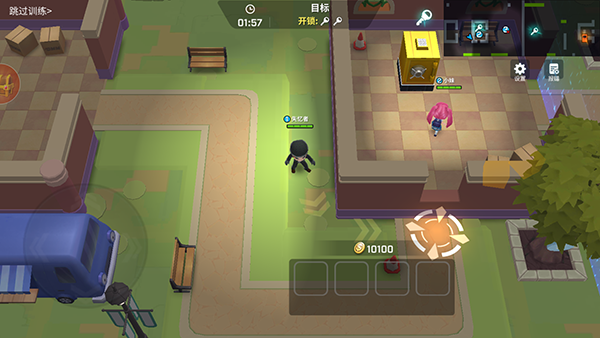 4、角色技能与道具:每个角色拥有独特技能(如隐身、加速、陷阱布置),搭配丰富的道具卡(火箭筒、医疗包、传送门等),玩法灵活多变。