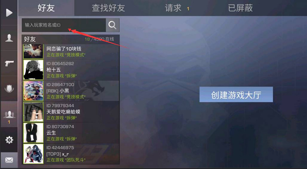 适合大家添加线下的小伙伴为好友时使用。由于对峙2手游中玩家彼此的ID是不会出现重复的,因此我们只需要记住小伙伴的名字或者数字ID,然后同样点击主界面右上角的标志为两个人的按钮,选择ID搜索并输入小伙伴的名字即可。