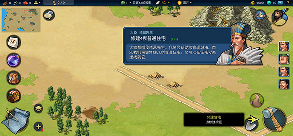 4、第一个任务就是建造四所住宅,点击右下角的斧头按钮,然后点击普通住宅,将其拖动到任务点,就可以了,不过需要有一段时间才能建造出来。