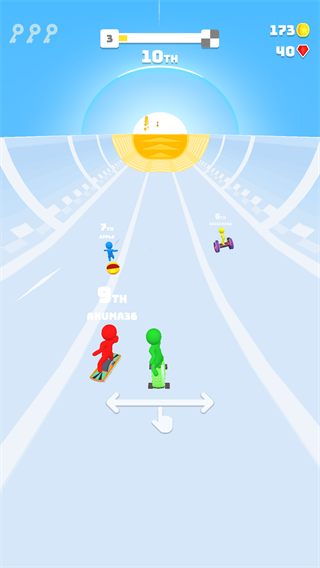 2、玩家需要通过向左或向右滑动屏幕以引导角色冲向终点。