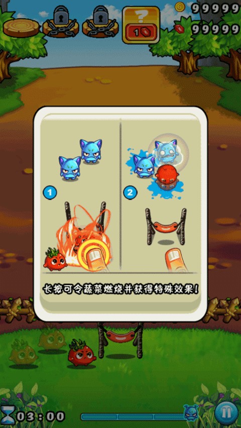 燃烧的蔬菜安卓版是超好玩的塔防弹射游戏,画面清新2D风格,特效炫酷。操作也很简单,游戏玩法其实就是把【植物大战僵尸】和【愤怒的小鸟】两款大热游戏合在一起。这款游戏,燃烧的蔬菜安卓版的游戏玩法会像【植物大战僵尸】那样,玩家会面对一波波怪物的攻城,同时又能像【愤怒的小鸟】一样,玩家需要把角色弹出去撞击怪物,轻松干掉它们。