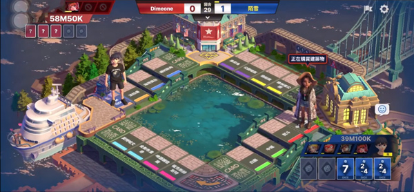 掷骰子前进、购地建造,压迫对手资金至破产。