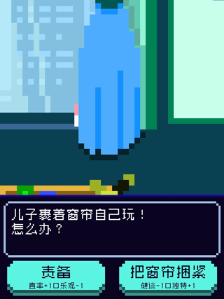 5、儿子裹窗帘自己玩,玩家可以选择“责备”或是“把窗帘捆紧”。