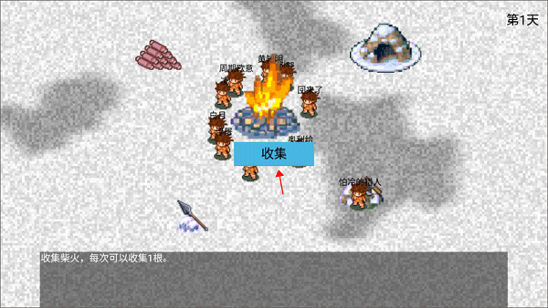 4、点击画面右下角那有斧头的那个小土堆,然后再点击收集,玩家就可以收集柴火了。