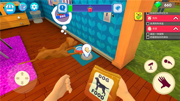 3、给女儿梳理头发,给狗狗添加食物,还要把球扔给丈夫互动。