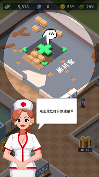 3、医院扩建完成后,点击场景中的加号即可解锁并建造新科室。