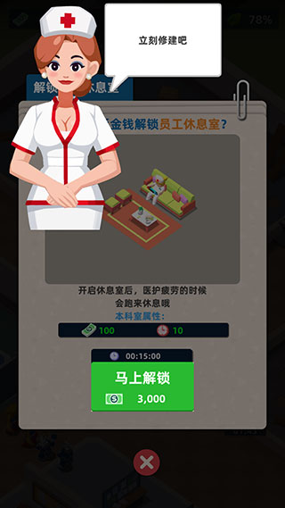 2、采用极具挑战性的经营玩法,玩家需合理布局各种医院设施,展现策略与智慧,以推动医院不断发展。