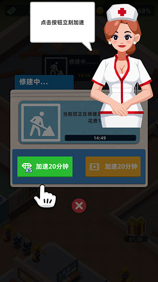 4、加速有两种途径,一是消耗钻石进行加速,二是看广告加速,当倒计时结束后,新科室就能修建成功了。