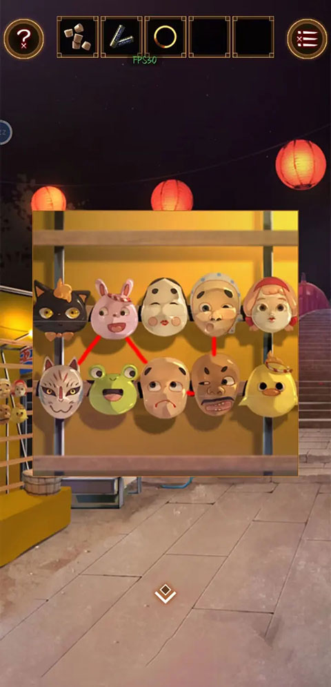 4、在面具摊上有同样的面具,观察面具会发现射击摊位的摆放一致,所以只要看面具视线得到线索。
