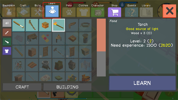 7、玩家可以点击Learn来学习一些高级合成道具的制作方法,但合成需要消耗足够多的材料。