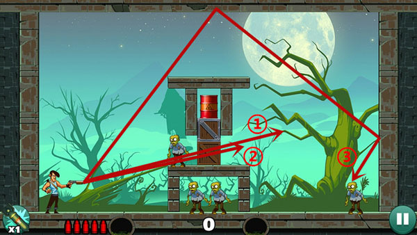 4、办法引爆油桶杀死下面的两个僵尸,第三个僵尸按照图中的轨迹即可打中。