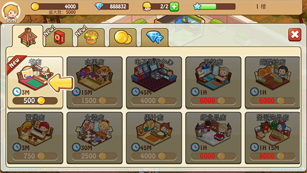 1、进到游戏后,首先,让玩家建设一个供顾客购物的『书店』,点击商店,选择书店就可以了。
