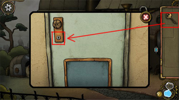 3、点击道具栏中的钥匙,再点击门锁,就能打开大门。