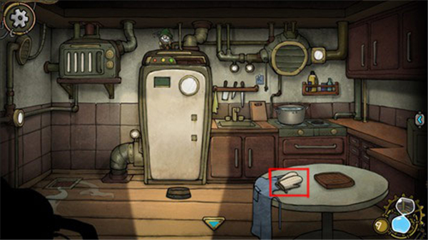 7、进入厨房后,玩家可以看到桌子上放着一双隔热手套,点击获得手套,再点击桌子上的煎饼,需要解开里面的谜题才能拿给妹妹。