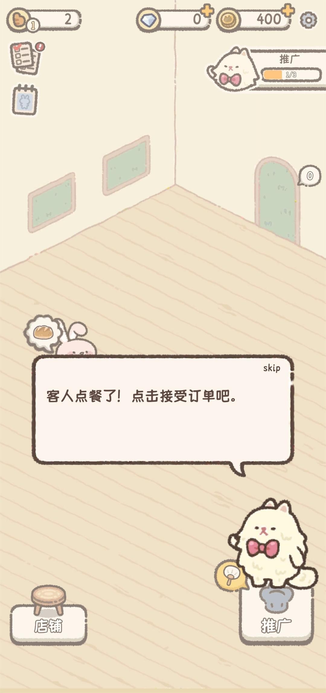 1、首先是基础的玩法,当客人头上出现气泡时,我们需要点击气泡上菜。(后续招到服务员就可以解放双手啦!)