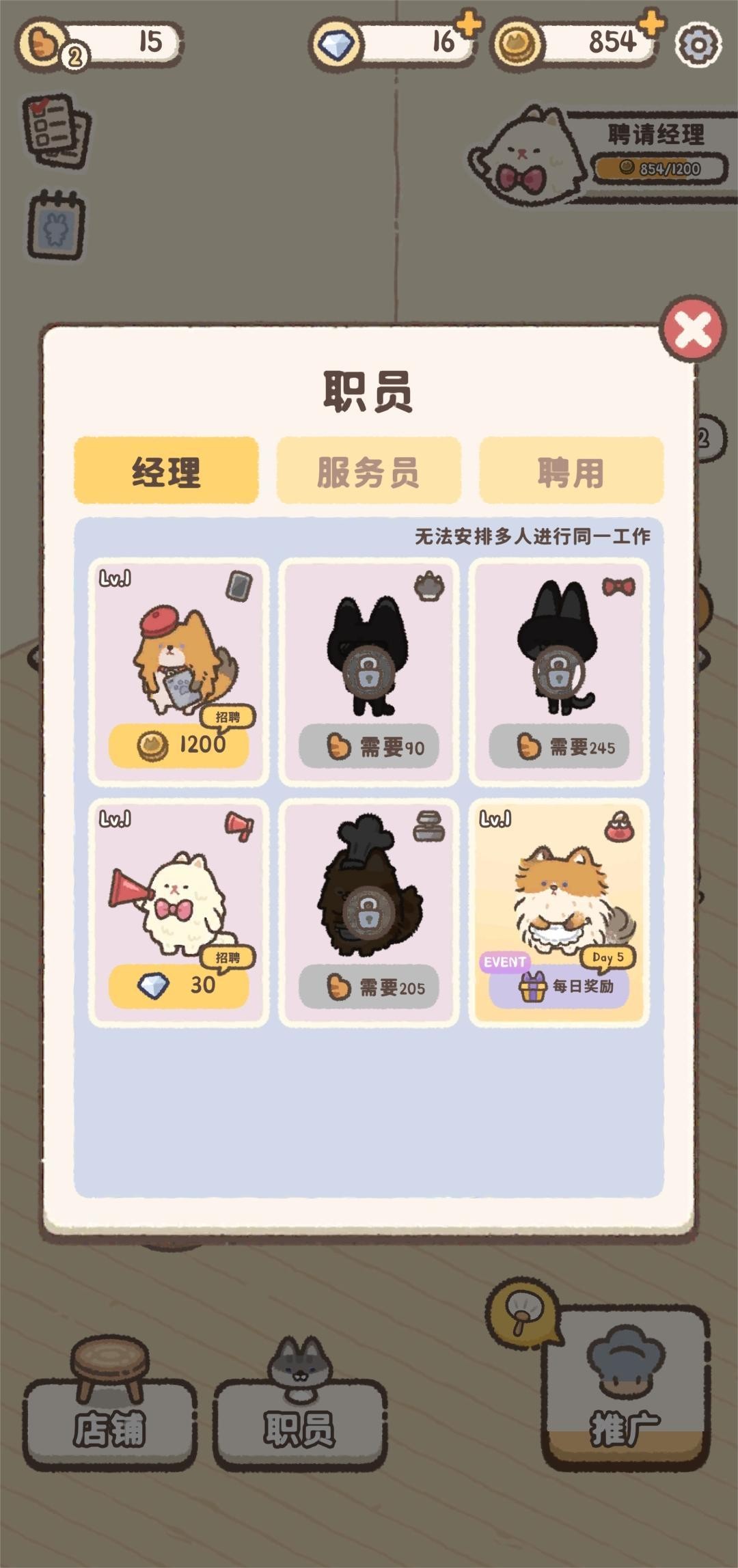 6、达到一定等级就可以雇佣职员。经理小猫们都有不一样的技能,例如赶走讨厌的客人、加快推广速度等等。