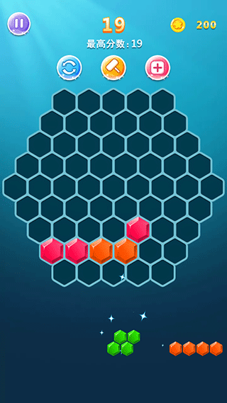 将屏幕下方的三个备选方块拖入宫格中,一行或一列铺满即可一口气消除,直至备选方块再也无法放置则导致游戏结束。