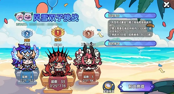挑战风雪双子,层数越高奖励越多,冲榜即可领取限时稀有好礼。