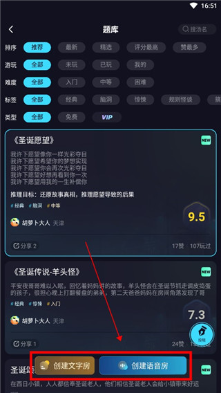 2、从剧本列表中挑选你感兴趣的题材作为房间剧情基础。