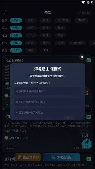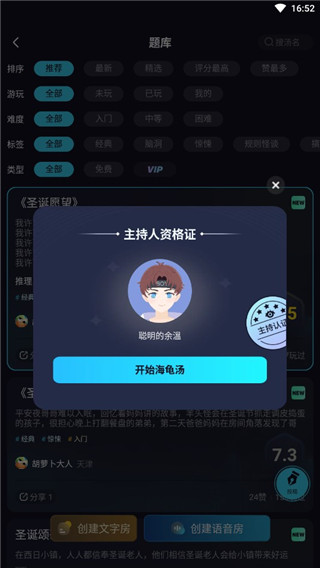 心跳海龟汤手游为玩家打造出融合语音社交与烧脑推理的沉浸式互动空间,可通过语音文字与好友实时沟通。心跳海龟汤手游下载安装中是以海龟汤为核心,每道题目由一个简短离奇的情境引出,玩家需通过不断提问与逻辑推理,拼凑出隐藏在背后的完整故事。平台内收录了大量原创与经典的剧本内容,还配备专业主持人引导流程,让游戏更加顺畅有趣,避免冷场或规则混乱。