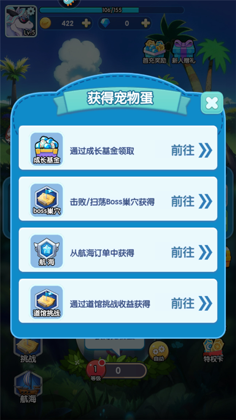 4、如果玩家把宠物蛋都抽完了的话,可以去Boss巢穴、航海、道馆挑战等玩法中进行获取.