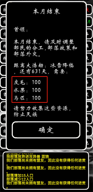 部落模拟器手机版以文字为基础的模拟经营游戏,玩家从一个小村庄开始,合理利用策略发展壮大自己的部落。玩家不只是要收集资源,还要应对灾难,确保部落的生存与发展。当然,游戏玩法简单,每个月点击“下一月”即可。每个月开始时,玩家可以选择是否举行占卜,消耗幸运值转运,之后安排部民的工作。部落模拟器手机版的每个月都会发生不同的事件,玩家需要依据情况进行处理。随着游戏进展,玩家将收集物资、解锁道具,慢慢将部落壮大,成为强大势力。