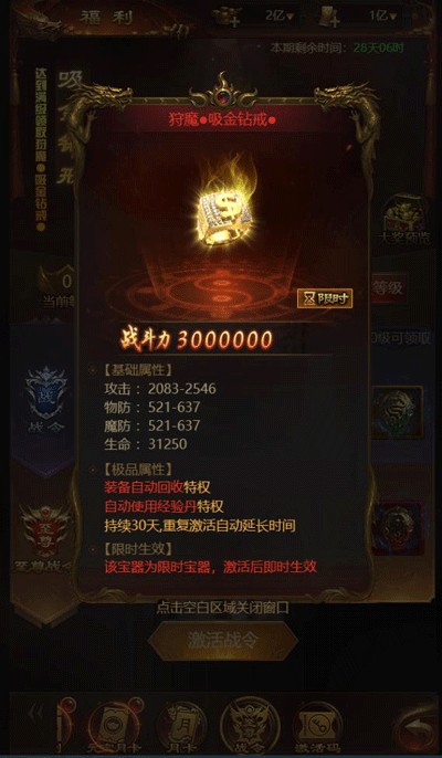 充值30元解锁暴走状态,提升全属性,开放暴力地图高收益。
