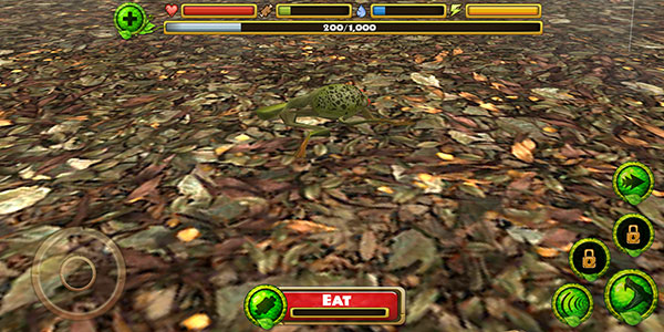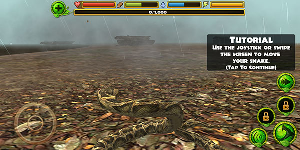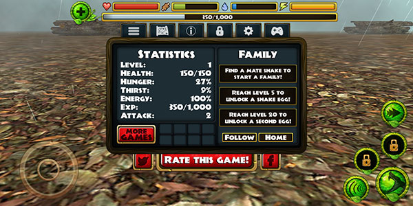 1、逼真的生存系统,要时刻照顾好生命值、饥饿、口渴和体力,保证蟒蛇活得好好的。