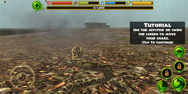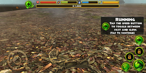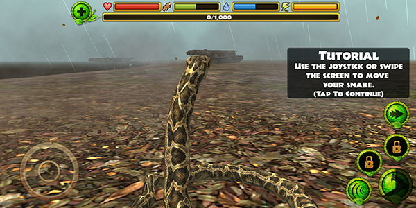 snakesimulator安卓(蟒蛇模拟器Snake Sim)是画面真实的休闲模拟游戏,玩家以蟒蛇视角体验生活。相比市场上常见的猎豹、老鹰模拟,这款游戏主角是冷血的蟒蛇,非常独特。游戏设有生命、食物、水和体力等多种状态,彼此影响,缺一不可,否则就会失败。当然,玩家需要在snakesimulator安卓中持续捕猎保持健康,随着等级提升还能解锁更强的捕猎技能,甚至挑战大型肉食动物,非常适合喜欢体验新鲜又真实的蛇类冒险的玩家。
