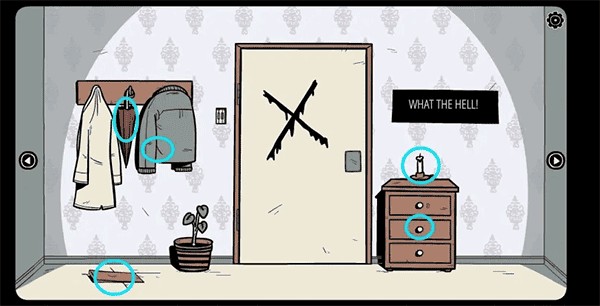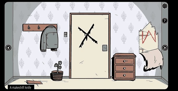 9、来到门口用钥匙打开抽屉拿走里面的「手套」,接着用玻璃碎片划开右边墙上的壁纸,再根据后面的提示打开被木板封住的门左侧的柜子获得「钥匙」和「开关」。