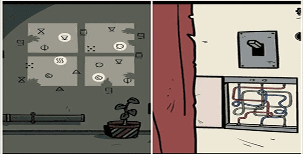 10、往右转点击窗户关上窗帘,然后使用手套完成右边的线路拼图并打开上面的开关。接着到划叉的门那里,将开关装在房间电灯的电源线上,关掉灯光后观察墙上的提示。
