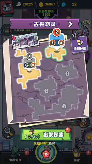 3、点击右下角【探索】,可以看到很多的地点和关卡,点击【出发探索】可以获得碎片或者认识招募更多鬼精灵来鬼屋上班,碎片可以合成获得进阶鬼怪,很有用。
