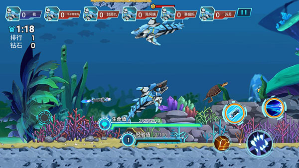2、每条机械鲨都配备独特的技能配置,合理组合撕咬、冲刺和超声波等一系列招式,形成专属战斗风格。