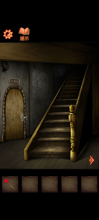 4、上楼点击201房间右边的灯的开关,开灯后从右下角桌子下方的红色绣鞋下获得钥匙。