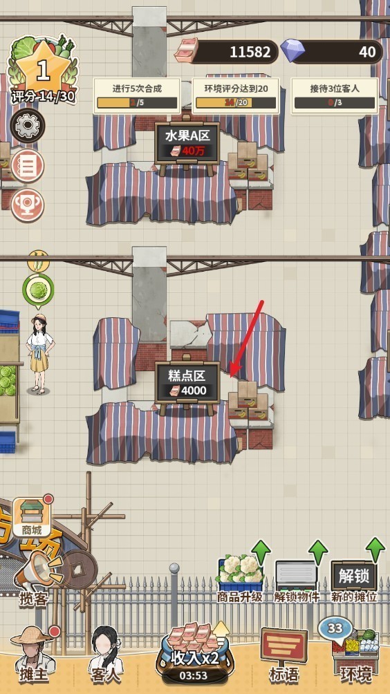 1、进入后用初始金币解封首个摊点,正式开始市场运营。
