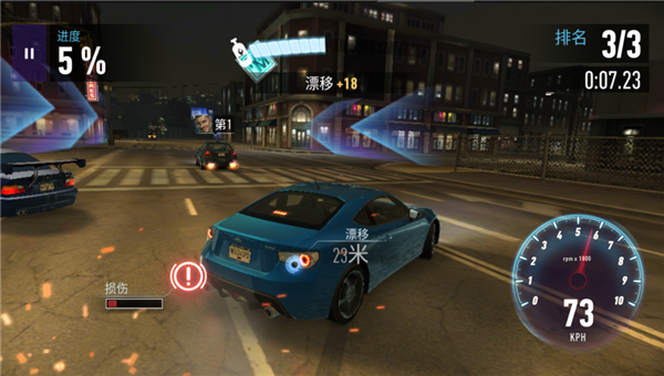 5、手指下滑就是进入漂移模式,需要注意的是下滑之后安装左右来控制赛车的漂移方向,偏移可获得氮气能量。