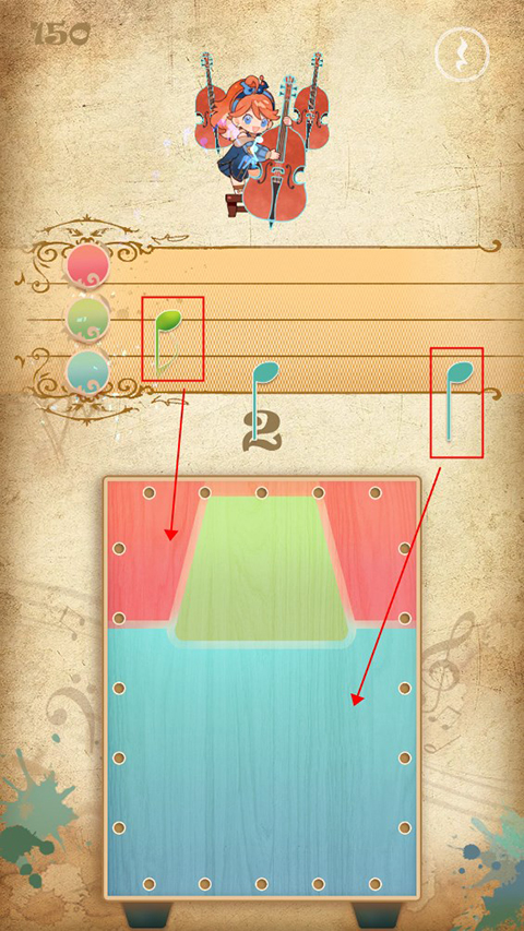 4、上方会出现音符需要点击下方对应颜色收集音符,可以根据鼓声节奏来击鼓。