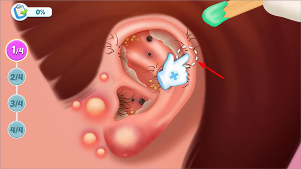 1、玩家进入游戏,首先是新手关卡,主要是引导玩家如何帮病人清理耳朵上的脏东西和发炎的地方。