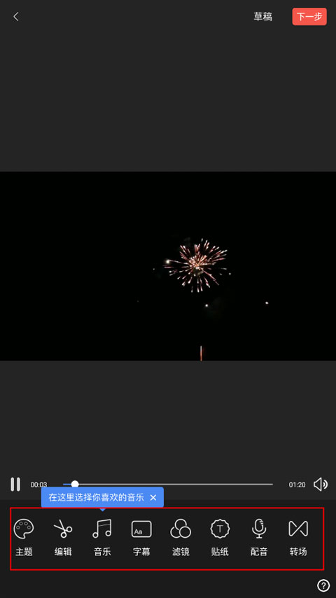 可选项涵盖剪辑、滤镜、字幕、音乐、转场等。