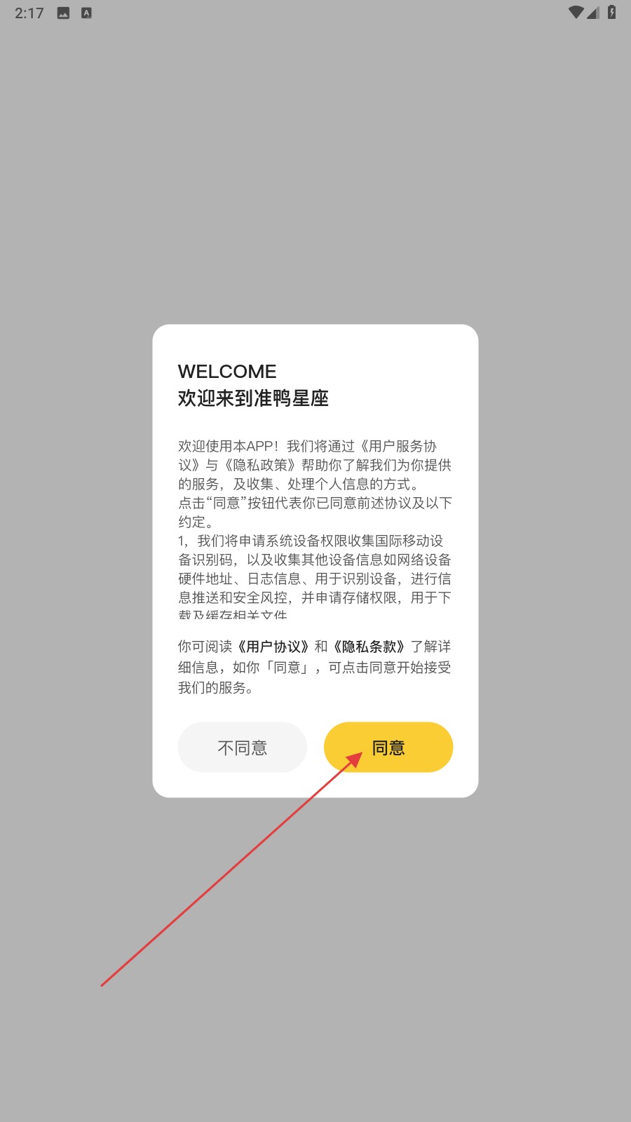 1、打开进入准鸭星座app后,用户需阅读协议与隐私政策并且同意。