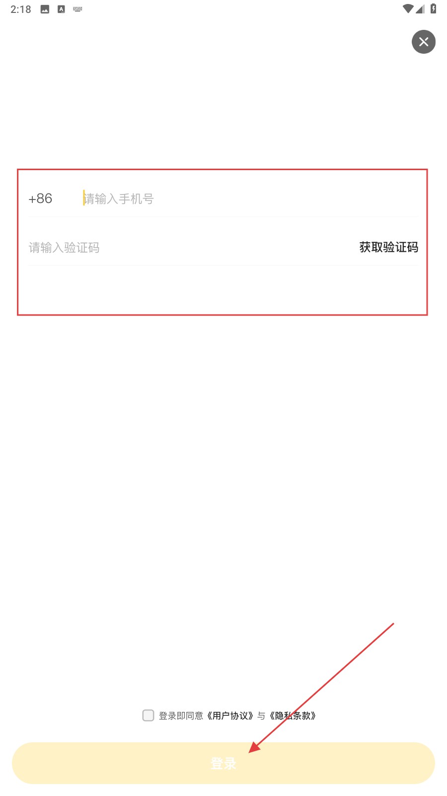 3、在这里就去输入手机号、验证码,勾选协议后点“登录”完成注册。