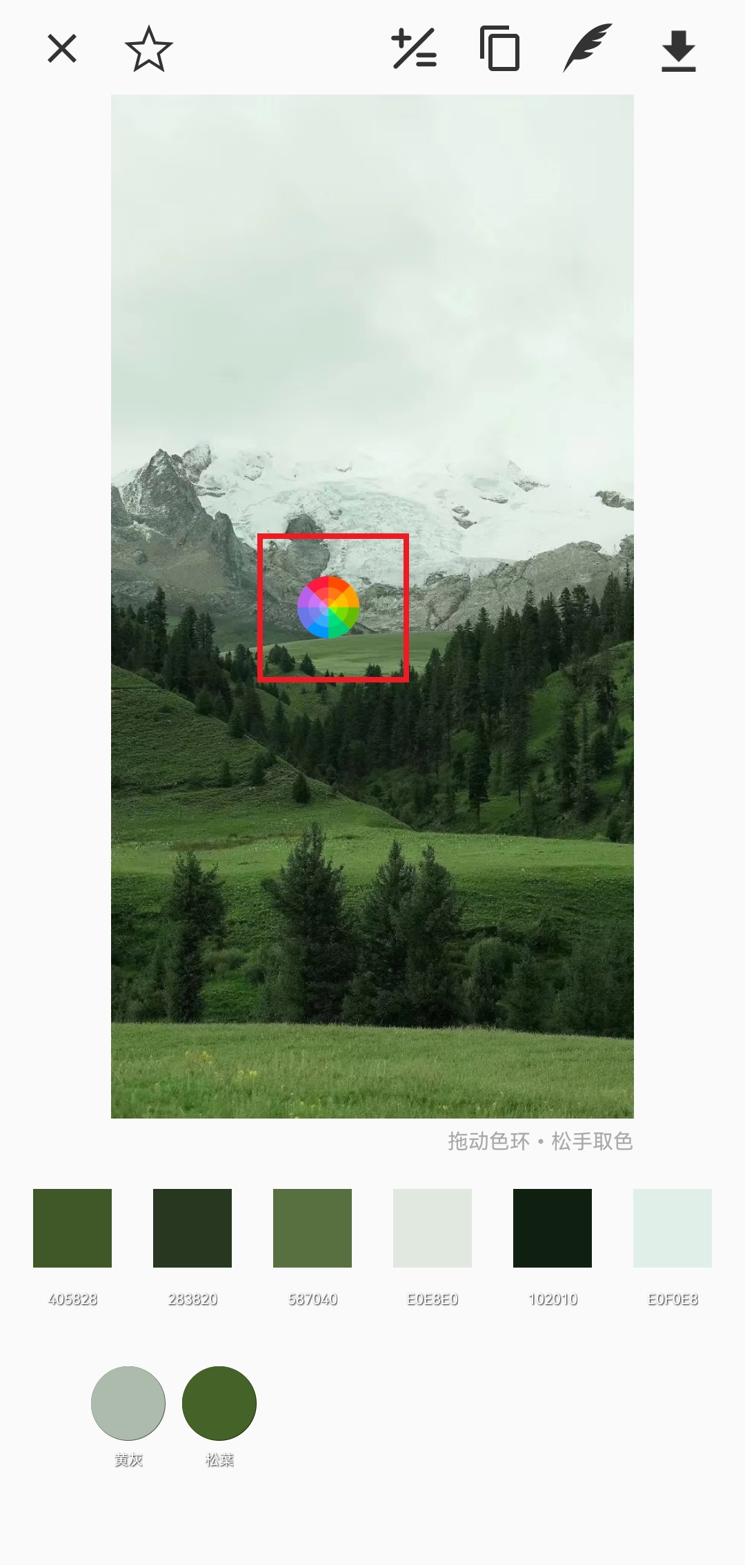 2、拖动中间的色环开始取色,就会出现所停留在图片上的颜色。