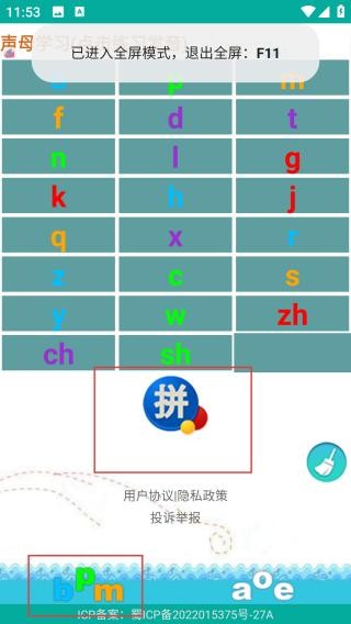 2、在学习界面展示各类声母如b、p、m、f等以不同颜色区分。